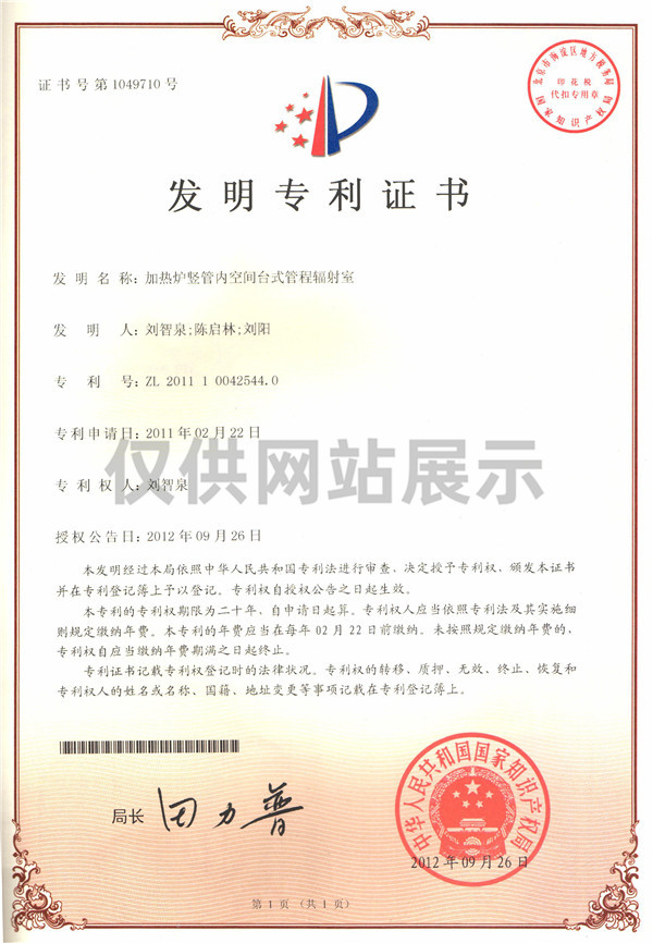 加熱爐豎管內(nèi)空間臺(tái)式管程輻射室